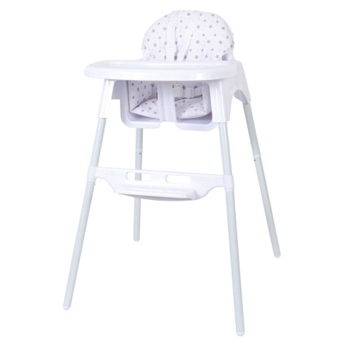 Az egyszerű, de nagyon praktikus baba etetőszék környezetbarát műanyagból készül. Kétféleképpen használható: magas etetőszékként vagy alacsony kisszékként. Hárompontos biztonsági övvel. A lábtartó 2 magasságba állítható, melyet később le is lehet venni.