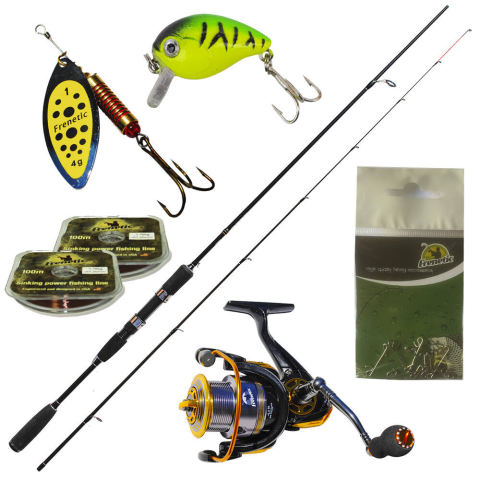 A szett tartalmaz egy osztott nyelű botot ( Frenetic perch )és egy 30-s 3+1csapággyal ellátott orsót( Frenetic Glory).200méter 0,20zsinórt ( Frenetic) , egy csomag gyorskapcsot ( Frenetic) egy wobblert( Frenetic) egy körforgó villantót