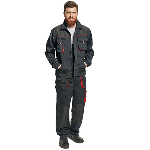 (BE-01-002) munkásdzseki fekete színű piros díszítésselMunkakabát számos praktikus zsebbel, könyéken és vállakon erősítésekkel.Alapanyag: 35 % pamut, 65 % poliészter, 235 g /m² Szín:Fekete-pirosMéret:48-62