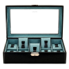 Óratartó doboz - méret: 30 × 17 × 8,5 cm, szintetikus bőrből, akár 10 órához A Friedrich Lederwaren luxus óratartó dobozt 10 darab óra tárolására tervezték. A tartó külső felülete szintetikus bőrből készül, a belső teret kék szövet borítja, finom szalagokkal. A praktikus doboz
