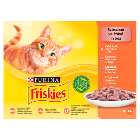 Friskies Friskies 12x85g Macskaeledel válogatás szószban- Csirkével, Kacsával, Lazaccal, Pulykával macskaeledel termékleírás