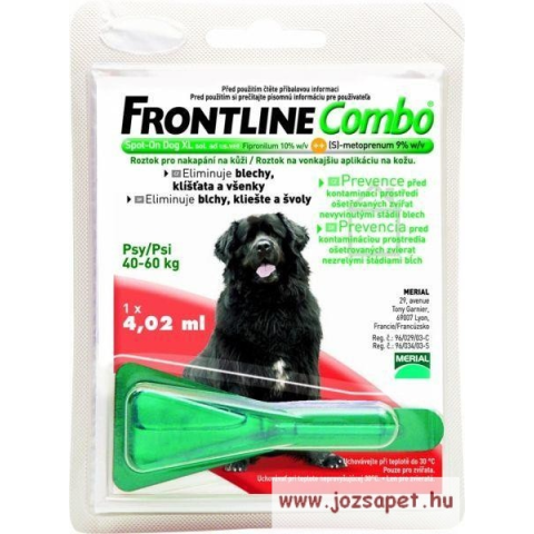Frontline Combo XL 40kg feletti kutyának 4ml Rácsepegtettő, spot-on. A Frontline Combo kullancsok ellen 4, bolhák ellen 8 héten át hatásos védelmet nyújt kutyájának. Frontline Combo XL 40kg feletti kutyának 4ml Rácsepegtettő, spot-on. A Frontline Combo