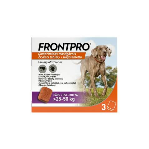 FRONTPRO rágótabletta kutyáknak L 25-50 kg 136 mg 3 tabletta Marhahús ízű rágótabletta bolhák és kullancsok ellen. Már 8 hetes kortól és 2 kg súlyú kutyáknak is adható. A bolha- és kullancsfertőzés optimális leküzdése érdekében rendszeresen, havonta al