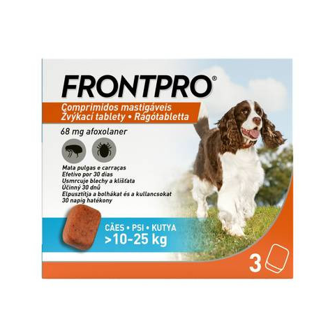 FRONTPRO Rágótabletta kutyáknak M 10-25 kg 68 mg 3 tabletta Marhahús ízű rágótabletta bolhák és kullancsok ellen. Már 8 hetes kortól és 2 kg súlyú kutyáknak is adható. A bolha- és kullancsfertőzés optimális leküzdése érdekében rendszeresen, havonta alka