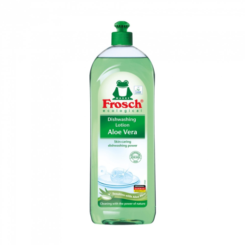 Frosch mosogatószer 750 ml-es kiszerelésben, amely Aloe vera kivonatának, valamint a növényekből származó tenzidek természetes összetevőinek köszönhetően hatékonyan távolítja el a zsíros szennyeződéseket, miközben gyengéd a bőrhöz, megóvja annak bőrsemleg
