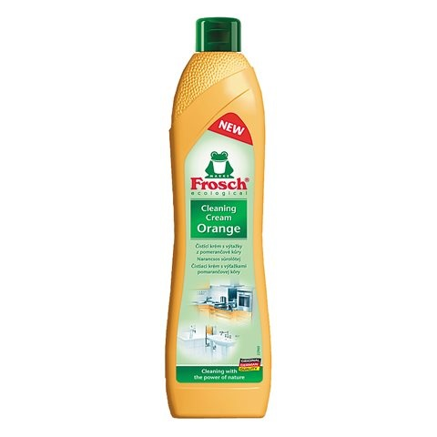 Súrolókrém, 500 ml, FROSCH, narancs (KHT438) A Frosch folyékony narancsos súrolószer hatékonyan távolítja el a zsíros szennyeződéseket, a vízkő- és szappan lerakódásokat minden kerámia, zománc, rozsdamentes acél és üvegkerámia felületről. Környezetb