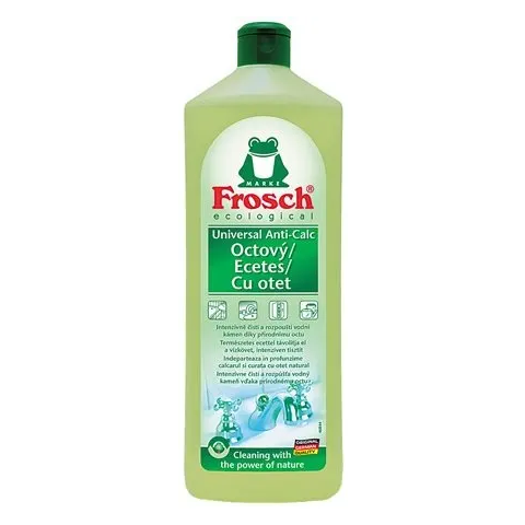 A Általános tisztítószer, ecetes, 1000 ml, FROSCH (KHT429) A Frosch ecetes univerzális tisztítószer kitűnően eltávolítja a vízkövet, vízfoltot és szappan maradékokat, valamint megtünteti a kellemetlen szagokat. Használható a fürdőszobában, WC-ben és a kon