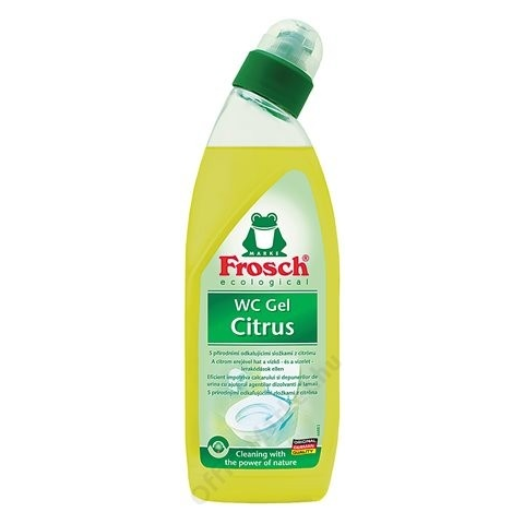 WC tisztítógél, 750 ml, FROSCH, citrus (KHT440) A Frosch citrusos WC tisztító gél természetes hatóanyagok segítségével, a citromkivonat erőteljes vízkőoldó hatásával hatékonyan távolítja el a szennyeződéseket még a perem alatt is. Szűkített kiöntő-nyíl