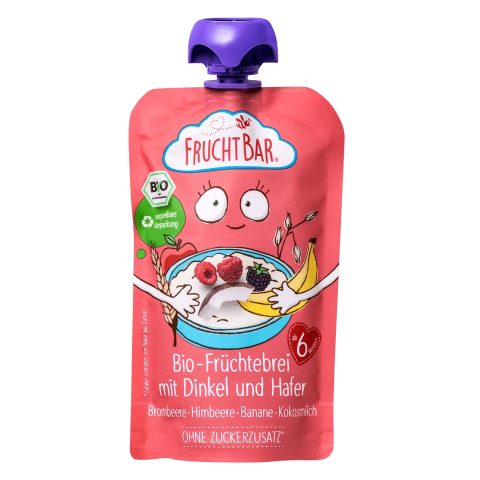 1 kép FRUCHTBAR Bio Gyümölcskása zab & tönköly, szeder-málna-banán-kókusztej 6hó 120g