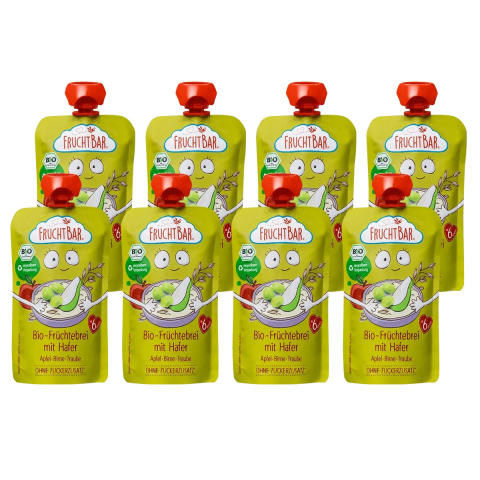 1 kép FRUCHTBAR Bio Gyümölcskása zabbal, alma-körte-szőlő 6hó 8x120g