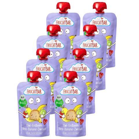 pürésített eper** (28%)pürésített banán** (27%)pürésített körte** (22%)pürésített kivi** (18%)kétszersült** (5%) ( búzaliszt , napraforgóolaj, élesztő)** biogazdálkodásból származik