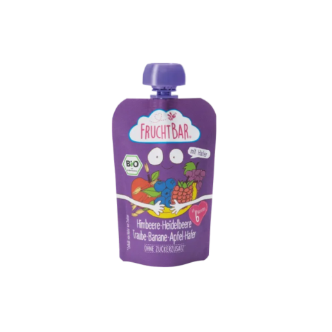 1 kép FRUCHTBAR bio málna, áfonya, szőlő, banán, zab 6hó/100g