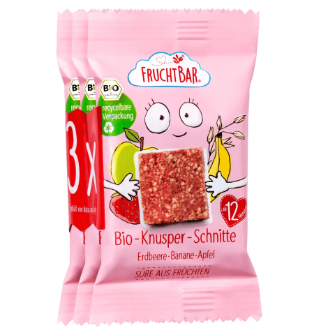1 kép FRUCHTBAR Bio Ropogós gyümölcsszeletek eperrel, banánnal és almával 12hó+ 3x23g