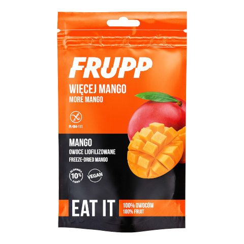 Frupp liofilizált mangó 15 g A csomagolás felbontása után azonnal fogyasztható, vagy desszertek, sütemények, joghurtok és italok kiegészítésére alkalmas. 100 g fagyasztva szárított mangó előállításához 0,5 kg friss mangót használtak fel. Praktikus,vis