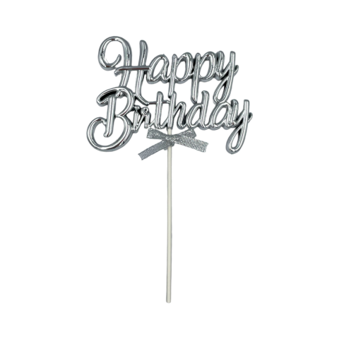 Torta beszúró, topper - Happy birthday (ezüst), műanyag Díszítsd tortáidat az alkalomnak megfelelő tortabeszúróval/topperrel. Tökéletes választás, ha gyorsan és egyszerűen szeretnéd a tortáidat feldíszíteni. Mérete:17,5 cm, A feirat szélessége: 11,5 cm