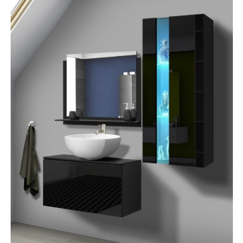 Venezia Alius-34 fürdőszobabútor szett magasfényű fekete színben (matt fekete oldalsó elemek). A készlet tartalmazza a faliszekrényt, a mosdószekrényt, a porcelánt mosdókagylót szifonnal és a tükröt. A lenyitható mosdószekrény tágas helyet biztosít a táro