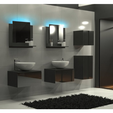 Venezia Alius A37 kétszemélyes fürdőszoba bútor szett magasfényű fekete színben. A készlet tartalmazz 2 db mosdószekrényt, 2 db faliszekrényt, 2 db polcos tükröt, valamint a porcelán mosdókagylókat szifonnal. A mosdószekrény tágas helyet biztosít a tárolá
