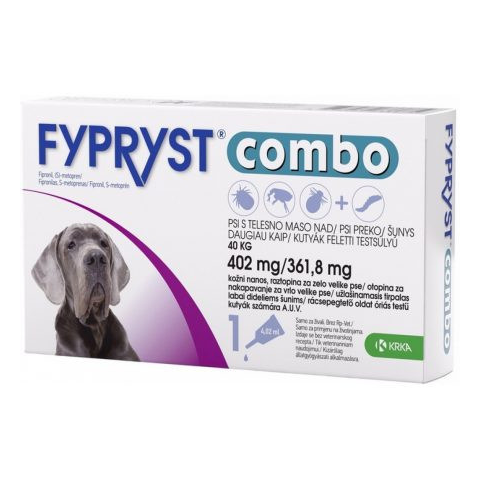 A Fypryst Combo egy rácsepegtető oldat bolhafertőzés, valamint a hozzá társuló kullancsfertőzés és/vagy szőrtetvesség kezelésére nagytestű kutyák részére. A Fypryst Combo egy rácsepegtető oldat bolhafertőzés, valamint a hozzá társuló kullancsfertőzés é