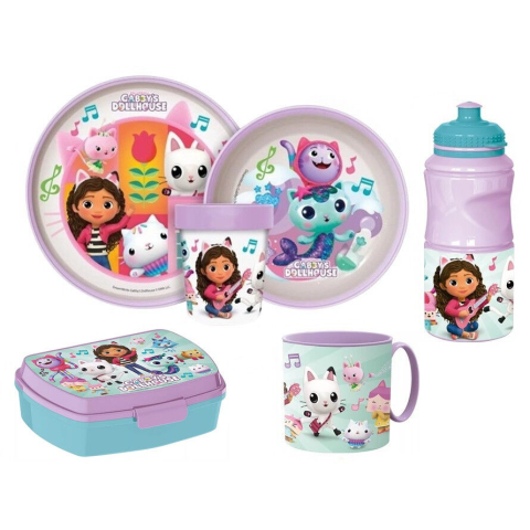 Gabby's Dollhouse étkészlet micro szett pohárral: Praktikus készlet, mely nem törik és mintájának köszönhetően a gyermekek szívesen esznek majd belőle. A készlet tartalma: 1 db mélytálka (Mikrózható műanyag) 1 db lapostányér (Mikrózható műanyag) 1 d