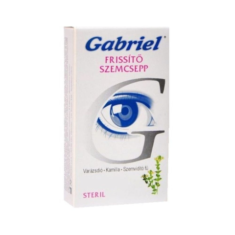 GABRIEL FRISSÍTŐ SZEMCSEPP 10ML: A Gabriel Frissítő szemcsepp egy varázsdiót, kamillát és szemvidítófüvet tartalmazó növényi desztillátum. Ezek a gyógynövények ismerten nyugtató hatással vannak, és fáradt, kimerült szemre javasoltak. A csepp frissé teszi