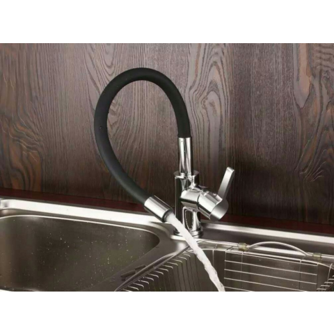 Flexibilis csaptelep fekete színben, Flexibilis kifolyó csővel. A csaptelep a króm betétekkel esztétikus látványt nyújt és egyúttal a legpraktikusabb megoldást is kínálja a tetszőlegesen hajlítható kifolyó csőnek köszönhetően. Magas minőségű króm aljzat