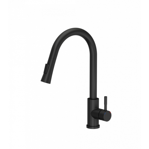 Konyhai csaptelep kihúzható kifolyóval, magassága 40 cm. A mosogató csaptelep matt fekete színben kihúzható kifolyóval. -Magas hőmérsékletnek- és a karcoknak ellenáll -Csomag tartalma:Csaptelep, flexibilis bekötő cső, rögzítők -Bekötő átmérő: 3/8 c