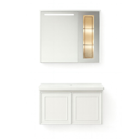 Stílusos fürdőszobabútor szett, amely ötvözi a modern dizájnt a praktikus megoldásokkal. A világos, minimalista forma tökéletesen illik mind a modern, mind a klasszikus fürdőszobai belső terekhez.