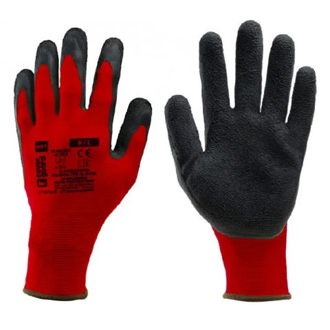 Termékleírás 13-as kötésű, piros poliészter védőkesztyű tenyerén fekete, emelt szinten csúszásbiztos latex mártás kiváló fogásbiztosság és extra tapadás szellőző kézhát, gumírozott mandzsetta Előnyök: mechanikai védelem csúszás elleni védelem kiváló