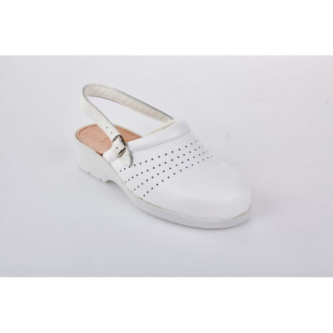 Pántos klumpa acél lábujjvédővel, magasabb sarokrésszel, antisztatikus, olajálló, csúszásmentes fehér PU talp, ütődéselnyelő emelt sarok, lyukacsos, szellőző, fehér szintetikus bőr felsőrész, kényelmes talpbélés, csatos sarokpánt, könnyű súlyú, egészs