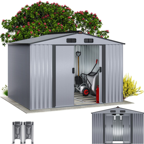 A kerti szerszámok biztonságosan tárolhatók a fémházban, amely kétrészes tolóajtóval van ellátva. Négy szellőzőnyílással a tetején - kettő elöl és kettő hátul. Az ajtókilincsekhez lakat rögzíthető (nem tartozék). Az időjárásálló szerszámház padlószerkezet