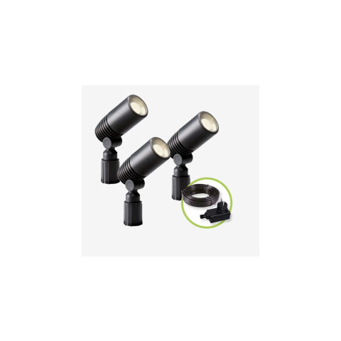 Az alder szett három alder világítótesttel rendelkezik, amelyek az egész kertet megvilágítják. A 12 V-os fekete műanyag lámpatestek alacsony talpakra vannak felszerelve, lehetővé téve a reflektorok bármely magasságba törté