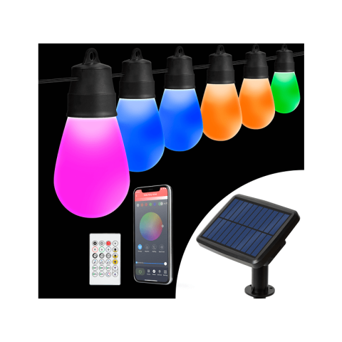 Egy hangulatos teraszra, kertre vágyik? Dobja fel otthonát energiahatékony, szolár fényfüzérrel! A hagyományos villanykörtére hasonlító fényfüzér, amely jól mutat bármely kerthelyiségben. A színes LED-ek beállítása a tartozék távirányítóval vagy okostelefonra elérhető, ingyenes alkalmazás segítségével lehetséges. Többféle előre beállított hangulat és fényprogram közül választhat, akár minden LED más színnel is képes világítani. Kiváló választ
