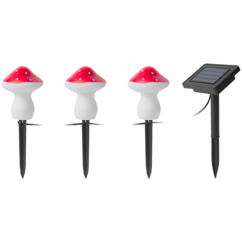Három gombából álló napelemes lámpa szett, amely varázslatos hangulatot teremt bármely kertben. Egyszerűen szúrja le a leszúrótüskéket teljesen a földbe, így érhető el az a hatás mintha a gomba ott nőtt volna a földön. Kiváló dekorációs eszköz, amely fahánccsal borított vagy köves környezetben is jól mutat. A szolár paneles egység a rejtett elhelyezés érdekében 200 cm kábellel rendelkezik, míg a gombák között 50 cm kábel áll rendelkezésre. A gombák p