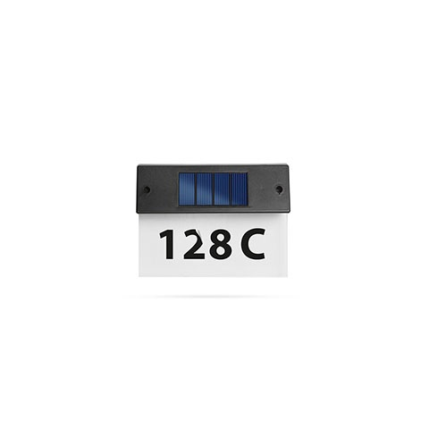Négyzet alakú, LED világítású házszámtábla, napelemes töltéssel. A lámpatest fekete színű műanyag házzal készül, 5 db hideg fehér leddel szerelve.