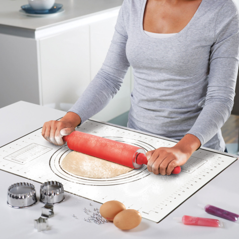 Méretpontos nyújtást segítő skálázott szilikon lap, amely használatával gyorsan készíthet bármilyen tésztából kör, négyzet, téglalap alakú süteményt. Széles körű felhasználás: pizzatészták, aprósütemények, mézeskalács, tortalap, fondant nyújtásához egyar