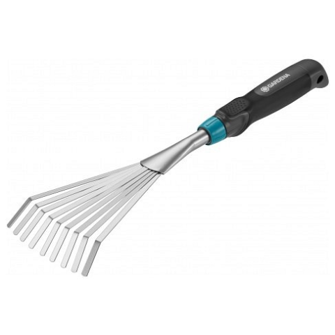Gardena Comfort kisseprű (8956-20). Ideális eszköz a gyom, levél, fűnyesedék összegereblyézésére virágágyásokban. Kitűnő minőségű acélból készült, bevonattal ellátott. Markolata puha elemekkel rendelkezik, így még húzó mozdulatoknál sem csúszik. A kissperű munkaszélessége 12 cm. Ellenáll a korróziónak.