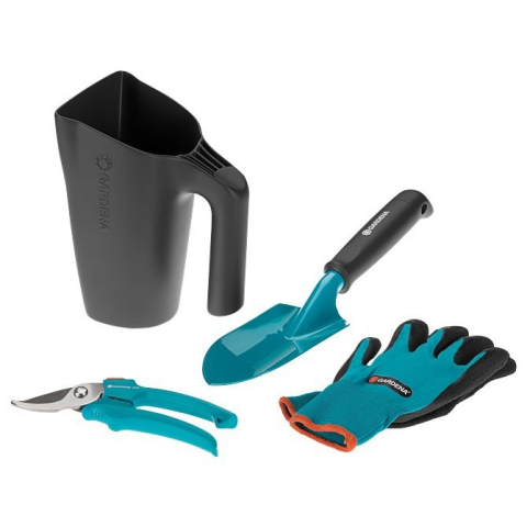 praktikus készlet többfunkciós kannával hobbikertészeknek Ez a praktikus készlet tökéletes belépő a GARDENA kerti szerszámok világába. Tartalmaz egy többfunkciós műanyag kannát, amely például virágföld lapátolásához, illetve kis öntözőkannaként is használható. A készlet tartalmaz még egy viráglapátot, egy metszőollót és egy pár kesztyűt.