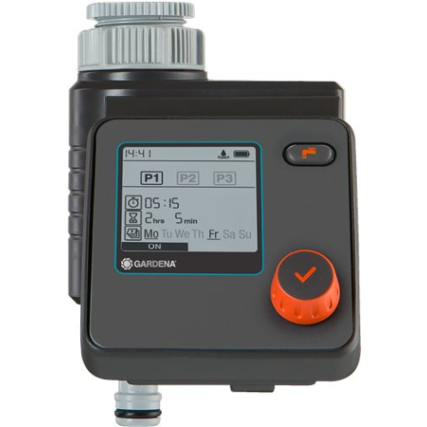 Öntözőkomputer - kijelzővel, érzékelőkkel kompatibilis, időjárásálló, levehető vezérlőpanel, időzítő és automatikus öntözés, 0,5 - 12 bar nyomás, 1 vízkimenettel, 26,5 mm (G 3/4) és 33,3 mm (G1) menet, 1 - 480 perc öntözési idő, 3 öntözési ciklus naponta, működés önállóan, zárt rendszer Rendszeres öntözésre van szükséged a kertedben? A Select öntözésvezérlő számítógép elvégzi helyetted az öntözési munkát. A Gardena öntözőkomputert csak