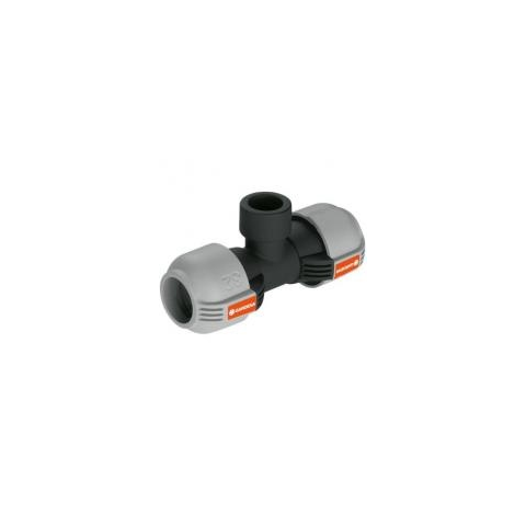 A Gardena T- kötőelem belső menettel 32 mm, 3/4". A Gardena Sprinklersystem részét képező kötőelem, melynek segítségével kiválóan csatlakoztatható a vezetékcsőhöz. A szabadalmaztatott "klikk és kész" csatlakozási technológiának köszönhetően az össze- és szétszerelés könnyedén, szerszám nélkül történik. Szétszereléshez a csavaros csatlakozást szükséges elfordítani 140°-kal.