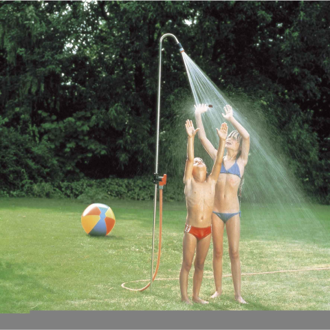Gardena kerti zuhanyzó. A vízátfolyás fokozat nélkül szabályozható. Könnyen felállítható, közvetlenül a fűbe vagy napernyő állványba szúrható. 1. elszennyeződéskor a narancssárga zuhanyfejet csavarjuk le, távolítsuk el a szűrőt 2. csatlakozási lehetőségek: 13 mm 1/2" vagy 19 mm 3/4" tömlőkhöz. Original gardena system elemekkel