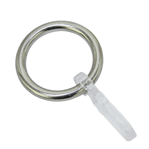 Fém függönykarika, műanyag áttetsző akasztóval Ø 20mm, 6 darab karika / csomag. Belső Ø 25mm, külső Ø 33mm, szélesség 4mm.
