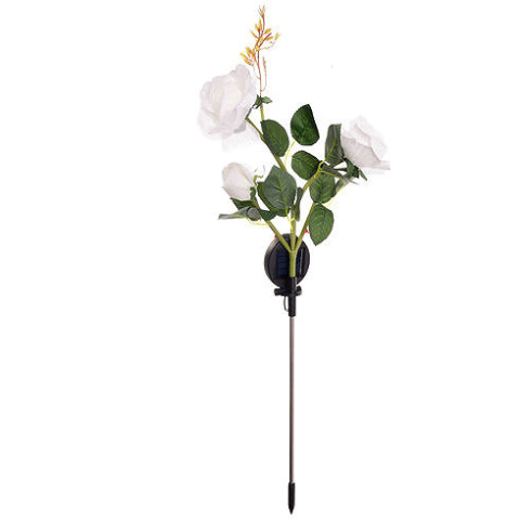Kerti dísz - energiatakarékos LED-ek, kedvezőtlen időjárási viszonyoknak ellenálló, IP44, 3 fehér virág, mechanikus be/ki kapcsoló, tüske földbe vagy virágcserépbe történő leszúráshoz, alkonyatérzékelő, fényforrás LED, LED-ek száma 3, beépített akkumulátor 1,2 V, 300 mAh, töltési idő 6-8 óra, működési idő 10 óra, a leszúrótüske hossza 6 cm