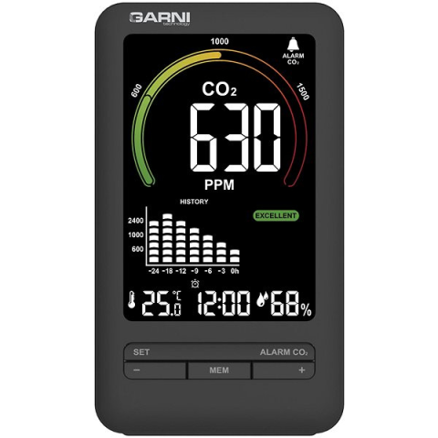 Levegőminőség mérő - mért értékek: hőmérséklet, páratartalom, CO₂ (szén dioxid), mérési tartomány 400 - 5000 ppm, hőmérséklet mérése -9,9 - 50 °C 1 °C pontossággal, páratartalom mérése 1 - 99 % 5 % pontossággal, hálózati + elemes tápellátással, optikai riasztás, kijelző, óra és ébresztőóra funkcióval, műanyag ház, önállóan működő egység A GARNI 206 OneCare CO₂-mérő megbízható segítőtárs a beltéri levegőminőség figyeléséhez. Szín