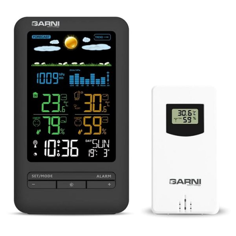 Időjárás állomás - otthoni, vezeték nélküli, rádióvezérelt csatlakozás, beltéri használatra, előrejelzéssel és valós idejű időjáráskövetéssel, ismételt ébresztés, ébresztőóra, alacsony elemfeszültség jelzése és mérési érték riasztás, mért értékek: légnyomás, hőmérséklet, páratartalom, idő és dátum megjelenítése, vezeték nélküli érzékelő hatótávja 60 m, maximum 3 vezeték nélküli érzékelő csatlakoztatható, önállóan használhat