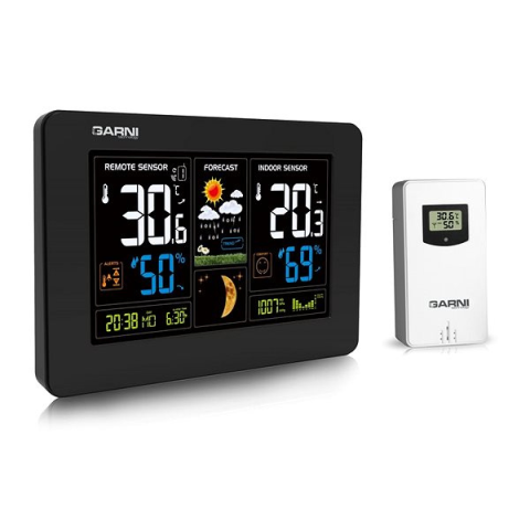 Időjárás állomás - otthoni, vezeték nélküli, beltéri használatra, előrejelzéssel és valós idejű időjáráskövetéssel, ismételt ébresztés, ébresztőóra, alacsony elemfeszültség jelzése és max. és min. érték memória, mért értékek: légnyomás, hőmérséklet, páratartalom, idő, dátum és holdállás megjelenítése, vezeték nélküli érzékelő hatótávja 60 m, maximum 3 vezeték nélküli érzékelő csatlakoztatható, önállóan használható,, fő egysé