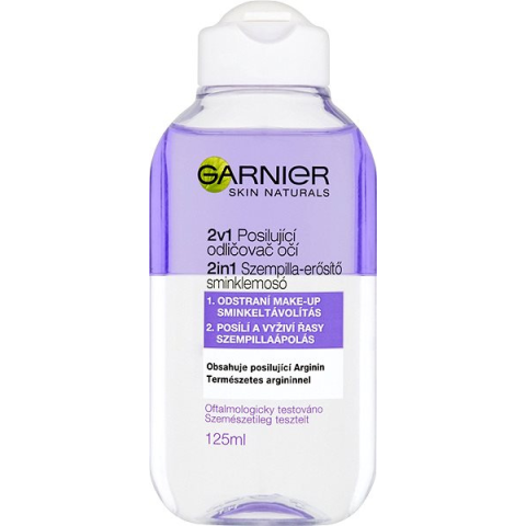Sminklemosó - kétfázisú, érzékeny és normál bőrtípusra ajánlott, 125 ml-es kiszerelés A Garnier Skin Naturals 2az1-ben szemlemosó egyedülálló, kettős hatású összetétellel rendelkezik. Az első a smink azonnali eltávolítása dörzsölés és nyomok hagyása nélkül, a második a szempillák erősí