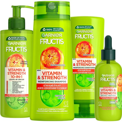 Hajápoló szett - gyenge és sérült hajra, a szett tartalmaz sampont, 10 in 1 öblítés nélküli maszkot, balzsamot és szérumot Nincs kitöltve Alternatív szöveg a fotóhoz! Garnier Fructis Vitamin & Strength 1125 ml hajerősítő szettRendkívül finomszálú és sérülékeny a hajad, amely könnyen töredezik és hullik? Akkor mindenké