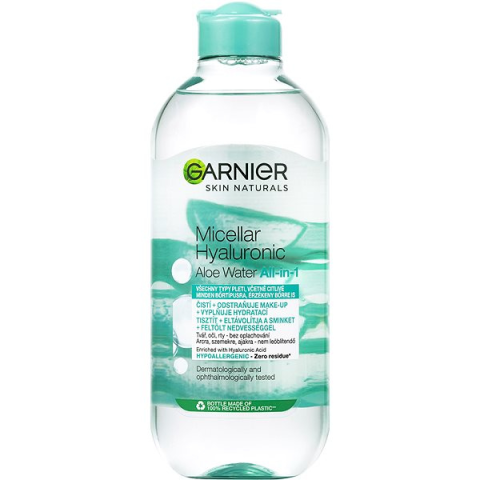 Micellás víz - érzékeny, zsíros, normál, kombinált és száraz bőrre alkalmas, vegán kozmetikum, 400 ml-es kiszerelésben A Hyaluronic Aloe micellás víz a legegyszerűbb és leghatékonyabb módja a smink eltávolításának, a bőr tisztításának és feltöltésének egyetlen lépésben, öblítés nélkül. A GARNIER Skin Naturals Micellar