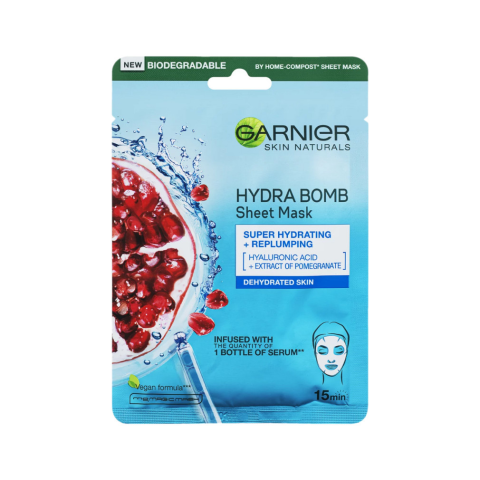 Garnier Moisture + Aqua Bomb szuper hidratáló, feltöltő textil maszk: Ez a textil maszk glicerinnel, gránátalma-kivonattal és hialuronsavval valóságos hidratáló bomba. Hidratálja és frissíti a bőrt. Érzékeny bőrre is. - Szuper hidratáló, feltöltő textil m
