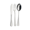 36 darabos Silvia evőeszköz készlet. 12 db 19,5 cm-es leveses kanalat, 12 db 19,5 cm-es villát és 12 db 21,5 cm-es kést tartalmaz. A minőségi rozsdamentes evőeszközök rusztikus megjelenésűek. Az anyag vastagsága 2,2 mm. Az evőeszközöket kézzel, akár mosogatógépben is lehet mosni. A szett a következőket tartalmazza: 227710001, 227710002 és 227710003.